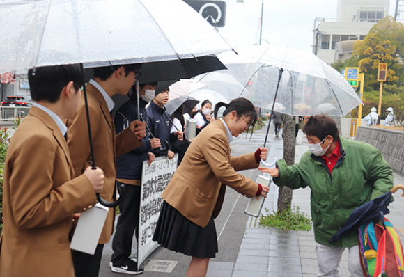 活動は生徒会が主導し、剣道部やソフトテニス部などの部員が参加。駅の出入り口付近に立った生徒らは、能登半島地震への募金と合わせ、通行人に協力を呼びかけた。