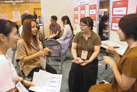 60の事業所が出展した会場では、軽快なロックやポップスの音楽も流し、Tシャツや半ズボン姿の学生たちが各ブースを回った。滋賀文教短期大2年の山田美奈さん(19)は「以前に参加した面接会とは全然違う雰囲気。フレンドリーに話が聞けた」と話した。