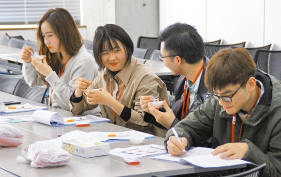 学生15人が出身地域別に中国北部、同南部、台湾・ベトナムの3組に分かれた。プリン、ケーキといったスイーツや、牛肉やアサリの粉末を入れたカップラーメン、こんにゃくで作った糖質オフのパスタ、ラーメンを試食した。