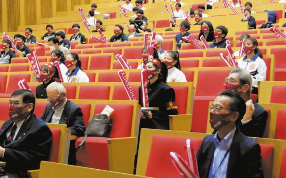 PVは、新型コロナウイルス対策で現地での応援を取りやめる代わりに、初めて企画した。来場者は大学名が入ったおそろいのマスクを着用し、大型スクリーンでテレビ中継を観戦。同大の選手が画面に映ると、スティックバルーンを打ち鳴らし、最終走者がゴールした瞬間、ひときわ大きな音を立てて快挙を祝った。PVに参加した同大応援団長の3年黒宮麻由さん(21)は「遠くにいても応援する気持ちは変わらなかった。新型コロナの影響で練習が制限される中、結果を出した仲間を誇りに思う」と笑顔を見せた。 (鈴鹿雄大)