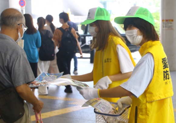 名古屋・名駅では、愛知大のボランティアサークル「愛大防犯POLICE」の学生や中村署員、県職員ら32人が、ニセ電話詐欺や侵入盗への注意を呼びかけるチラシやライト付きキーホルダーなど200セットを駅利用者に配った。サークル代表の同大3年、近藤玲斗さん(21)は「(学生が配れば)若い世代にも受け取ってもらいやすいと思う。まずは県民運動のことを知ってほしい」と話した。