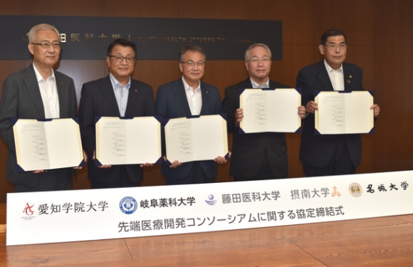 5大学は、医学部を持つ藤田医科大(豊明市)と、薬学部や歯学部など理系の学部がある愛知学院大(名古屋市)、名城大(同市)、岐阜薬科大(岐阜市)、摂南大(大阪府)。各学長が、コンソーシアムの事務局を置く藤田医科大で協定書に調印した。