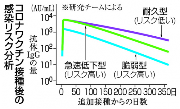 その結果、追加接種後の血中に抗体の免疫グロブリンG(IgG)が多く長期間残る「耐久型」、抗体が少なく減少が早い「脆弱(ぜいじゃく)型」、抗体は多いが早期に減少する「急速低下型」の三つの特徴的なパターンがあることが分かった。