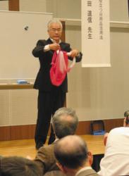 羽田教授は風呂敷を結んでリュックサック形の非常用持ち出し袋にする方法などを実演。「日ごろから近所の人と顔の見える関係を築いておくことが大切」と述べた。