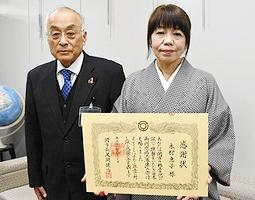 贈られた日本画は縦162センチ、横81センチ。麻紙に天然岩絵の具と金箔(きんぱく)、黒箔、膠(にかわ)を使い3体の円空仏を描いた。木村さんは「1つの木を3つに割り、樹木の生命の形がそのまま生かされて3体が成り立っていることが1番の魅力。本物を見てみたいというきっかけになれば」と話していた。(本間貴子)
