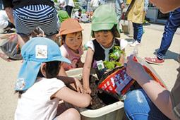 ゴーヤー以外にパプリカやナスなども植えた。年長の女児(5つ)は「植えるの初めて。おっきくなって」とシャベルを手に話した。(菅谷仁志)