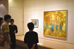 月をテーマに与えられた梅村愛さん(37)の「咲く」は、夕暮れ時に木々の間からのぞく月を捉えた風景画。「暖かい光が景色全体を包み込む絵を描きたかった」と語った。ほかに水にちなんだ「水音」や日の「陽光」などの抽象画が並ぶ。