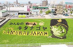 地元の名古屋芸術大の学生が考えた複数案から監督本人がデザインを選んだ。田んぼのキャンバスは縦43メートル、横50メートル。愛知県産の「あいちのかおり」など色の異なる計6種類で表現し、顔の横に「SAMURAI JAPAN」の文字も添えた。