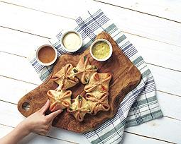 花をイメージした手のひらサイズのピザ6個のセットで、マルゲリータ、もちカルビ、バジリコポテトの具材を包んだ。3種類のディップソースが付き、好みの味を加えられる。考案したのは現代マネジメント学部3年の川口加奈子さん。「ちぎって、つけて、笑顔満開!」をテーマに、仲間と楽しく味わえるピザを目指した。アオキーズは、若い女性の発想を商品づくりに生かそうと椙山女学園大と連携し、アイデア35点の中から選んだ。2〜3人前で1900円(税別)。