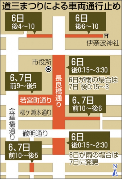 両日とも若宮町通りが歩行者天国となり、飲食の屋台が並ぶ。まつり開催に伴い、一部の道路は車両の通行が規制される。(近藤統義)