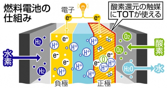 TOTが燃料電池の電極のうち、正極として使えるかどうかを水の中に入れて室温で調べた結果、触媒として安定した化学反応を繰り返すことが分かった。また、触媒能力は白金の7、8割という高レベルだった。