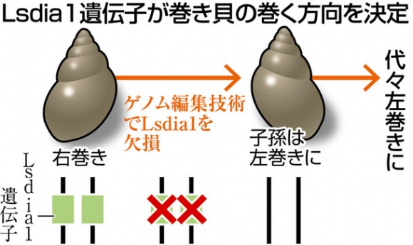 今回はゲノム編集という技術を使い、右巻きの貝でLsdia1遺伝子を人為的に欠損させたところ、その子孫が左巻きになり、代々左巻きが遺伝することを発見した。