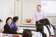 学⽣4⼈と外国⼈教員1⼈で⾏うALL ENGLISHの"超"少人数授業「PUT(パワーアップチュートリアル)」では、「世界の今」についてディスカッション。英語で考え、英語で発信する⼒を⾝につけます。また、さまざまな国籍とバックボーンを持った外国⼈教員の授業を通じ、国際感覚も養いながら国際的な視点や意⾒のまとめ⽅、英語によるプレゼンテーション技法などを磨きます。