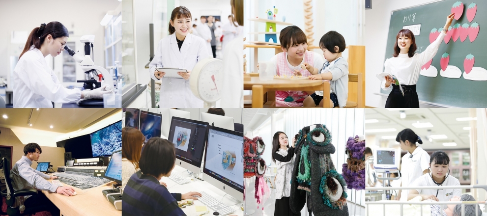 医療に強い学びをベースに、医療機関から食品メーカーまで幅広いフィールドで活躍できる管理栄養士を養成する「管理栄養学部」、幅広い専門知識を備え、子どものこころとからだをトータルケアできる養護教諭(保健室の先生)、保育士・幼稚園教諭、小学校教諭・特別支援学校教諭など、子どものスペシャリストを養成する「ヒューマンケア学部」、プロ仕様の制作環境で映像・デザイン・ファッションの各業界で広く活躍できるクリエイターをめざす「メディア造形学部」、国立病院機構 名古屋医療センターと連携し、高度な医療現場を支える看護師を養成する「看護学部」を設置しています。