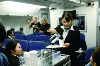 ANAやJALなどの航空会社と連携した「エアライン・ホスピタリティ科目」、外資系航空会社の正規訓練施設での研修や、企業で実際に就労経験ができる「エアライン・トレーニング・スタディ&インターンシップ」、採用試験合格に向けた「資格別・志望業種別対策講座」、学生主宰の情報交換と交流の場「エアライン業界研究グループ」といったさまざまなサポート体制が整っています。航空業界をめざす学生は、就職のために自分に何が必要かを考えたうえで、自らの意思で授業やプログラムを選択し、参加しています。その結果、名古屋外大では毎年、多数の学生が航空業界へ就職しています。